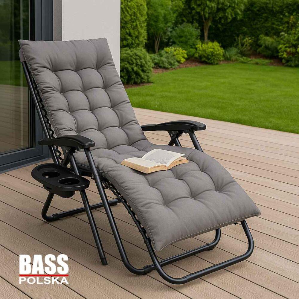 🌿 Садове крісло-шезлонг 2-в-1 з матрацом, підголівником і столиком для напоїв — сірий, Bass Polska